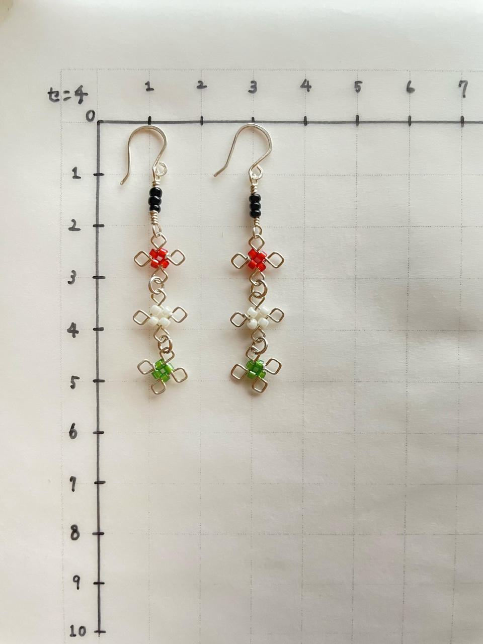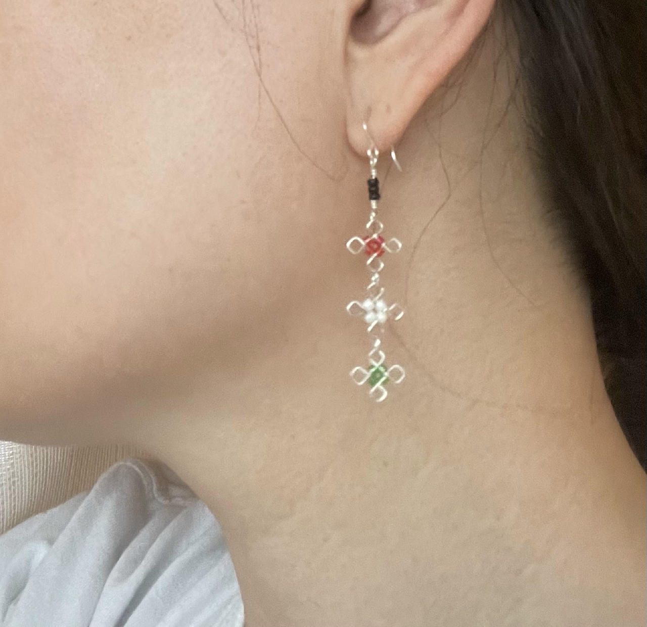 使用しているビーズ(黒、白、赤、緑)はパレスチナの国旗の色をあらわしています。思いを寄せているものをさりげなく普段の装いに取り入れたいかたにおすすめです。